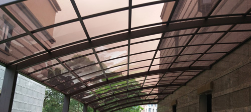 頂棚采用進(jìn)口聚碳酸酯板,抗沖擊是玻璃的數(shù)百倍,有效防止高空墜物